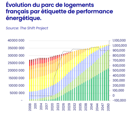 A l’inverse, la filière de rénovation devrait « monter en puissance » pour atteindre d’ici dix ans le rythme d’un million de logements rénovés chaque année, en ciblant en priorité « les logements les plus énergivores et consommateurs d’énergies les plus carbonées ». Pour le Shift Project, il faut « systématiser la rénovation globale et performante si possible en une seule fois, au détriment des gestes de rénovations mono-lots » « et amener tous les logements d’étiquette énergie DPE supérieures à C vers des étiquettes A, B ou C ».